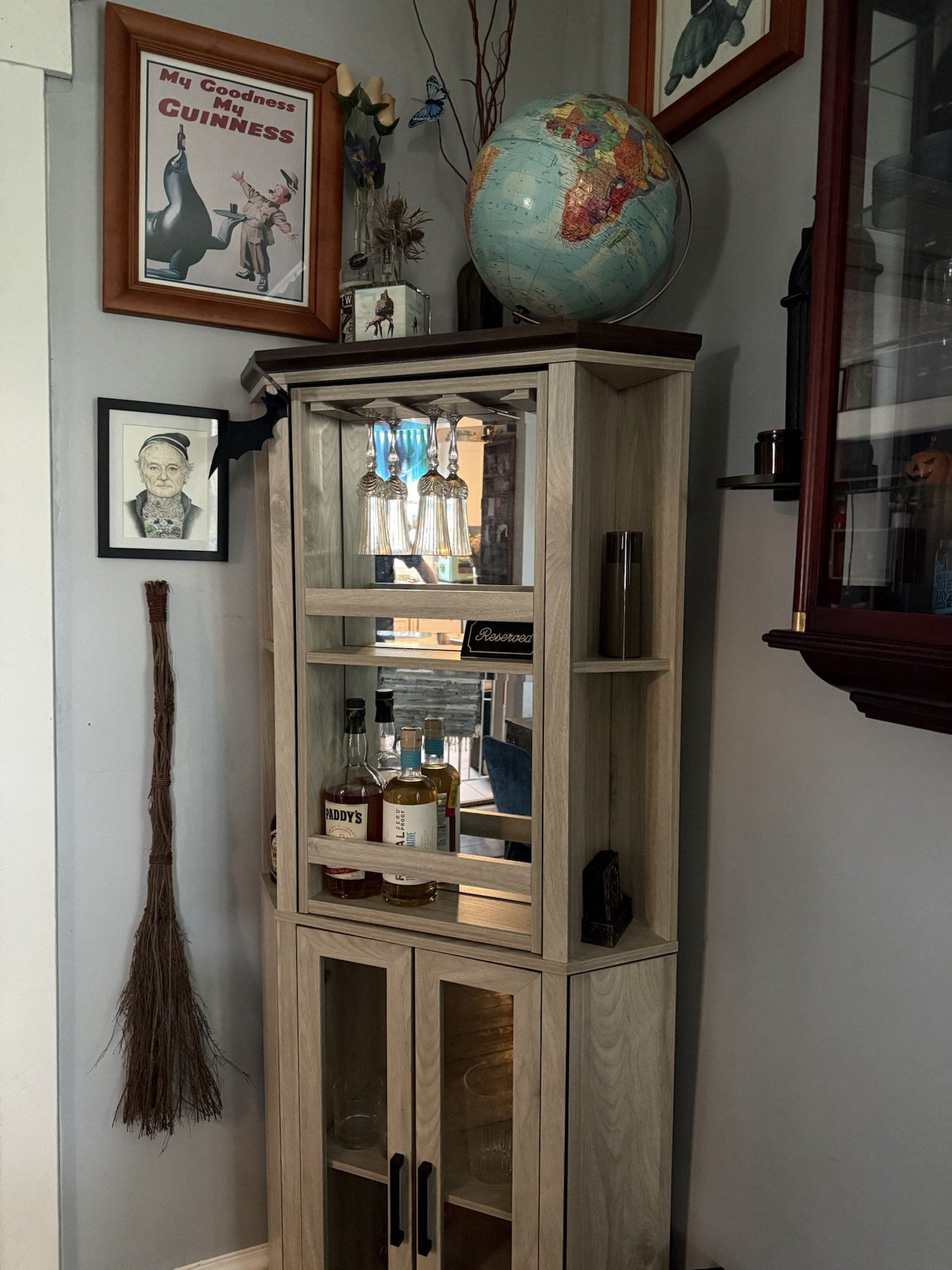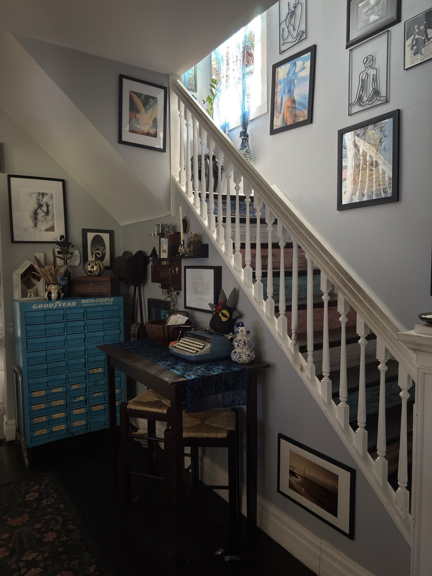 Our bedroom is the only other upstairs room documented, because the spare room and Dave’s office take turns in being fallout rooms. I have had that cheap “Nevermore” banner for years, and I was having a hard time finding a spot for it, until the panel was hung and there is where it lives now.