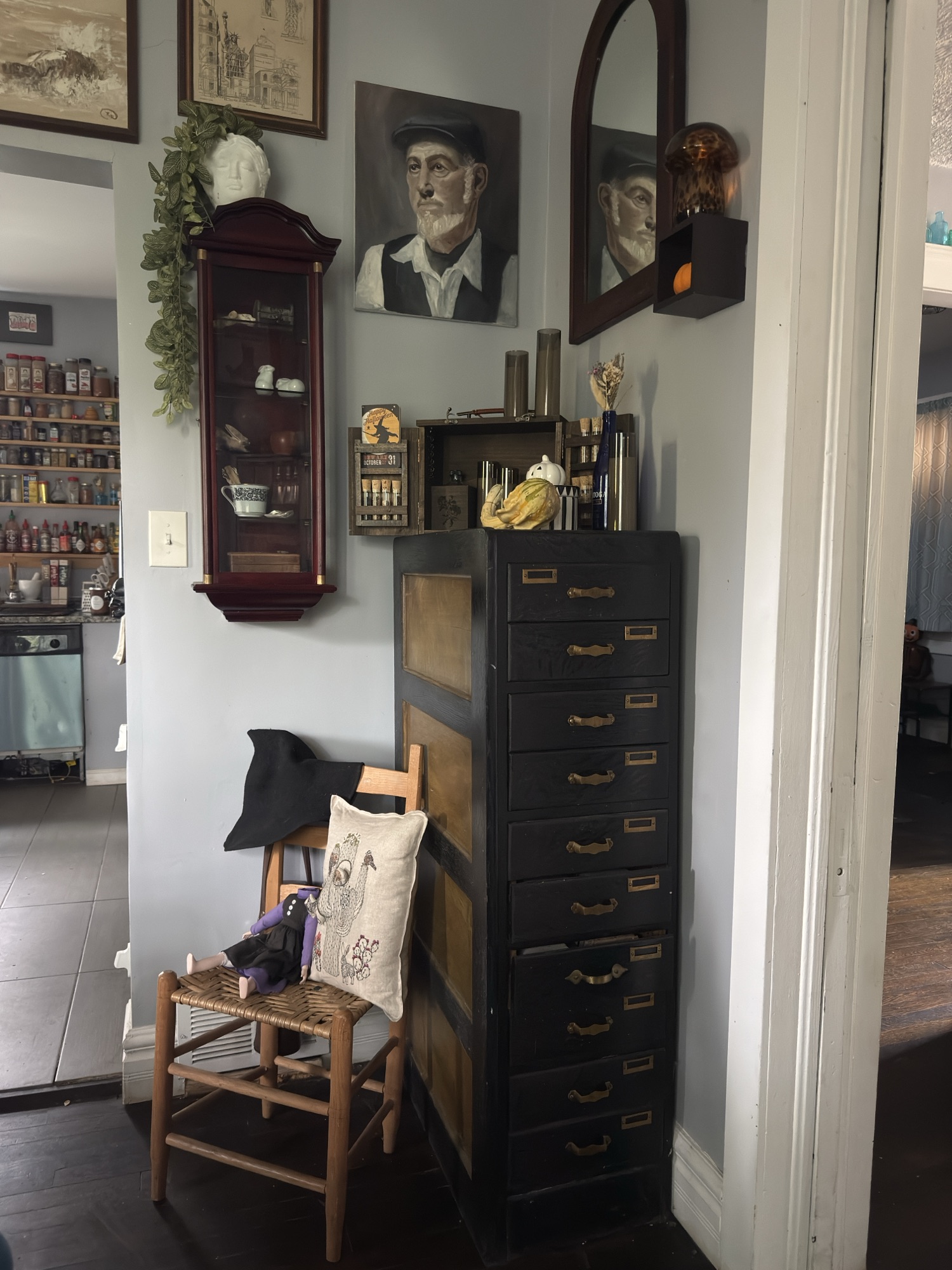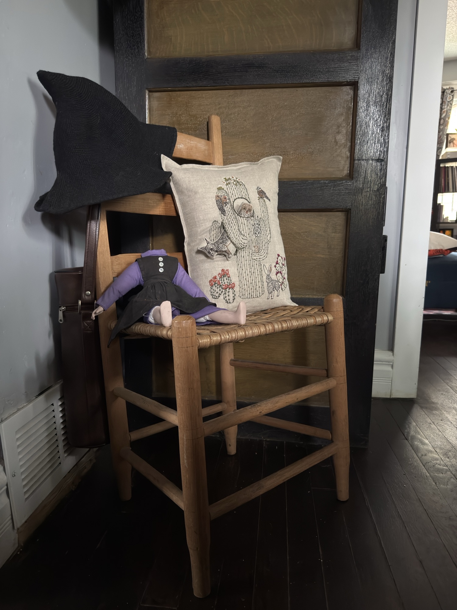 Our dining room is a work-in-progress, but very pretty at the moment. A headless doll prop from a photoshoot a few years back sits on the tinest chair, that I had picked up for a whole dollar. My brother had said that I needed an accent chair in my dorm, but there really wasn’t room in that studio. After acquiring this vintage, children’s chair that can barely hold a pillow, it became my “accent” chair.