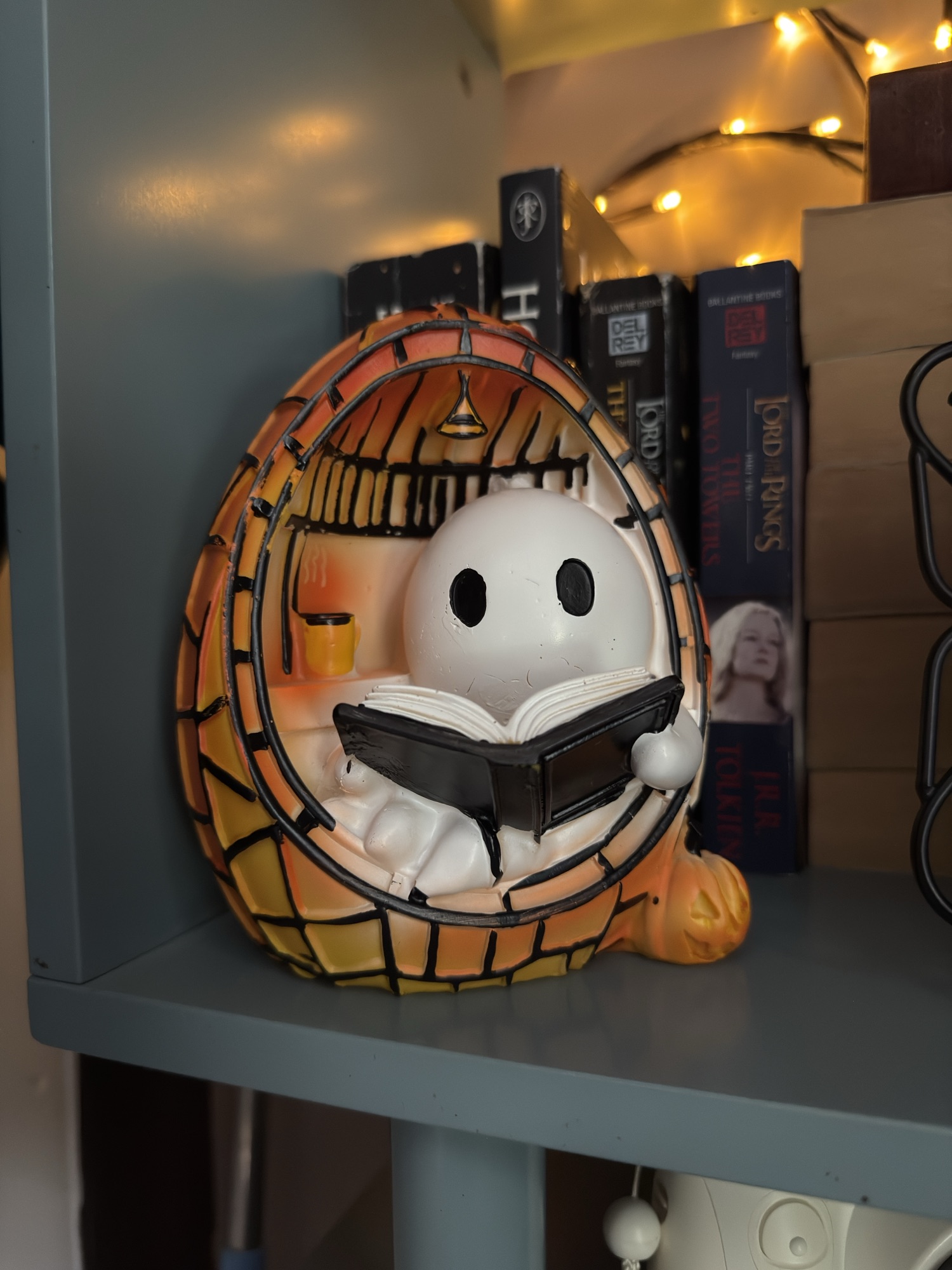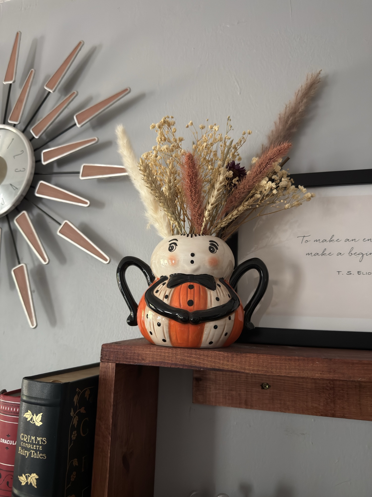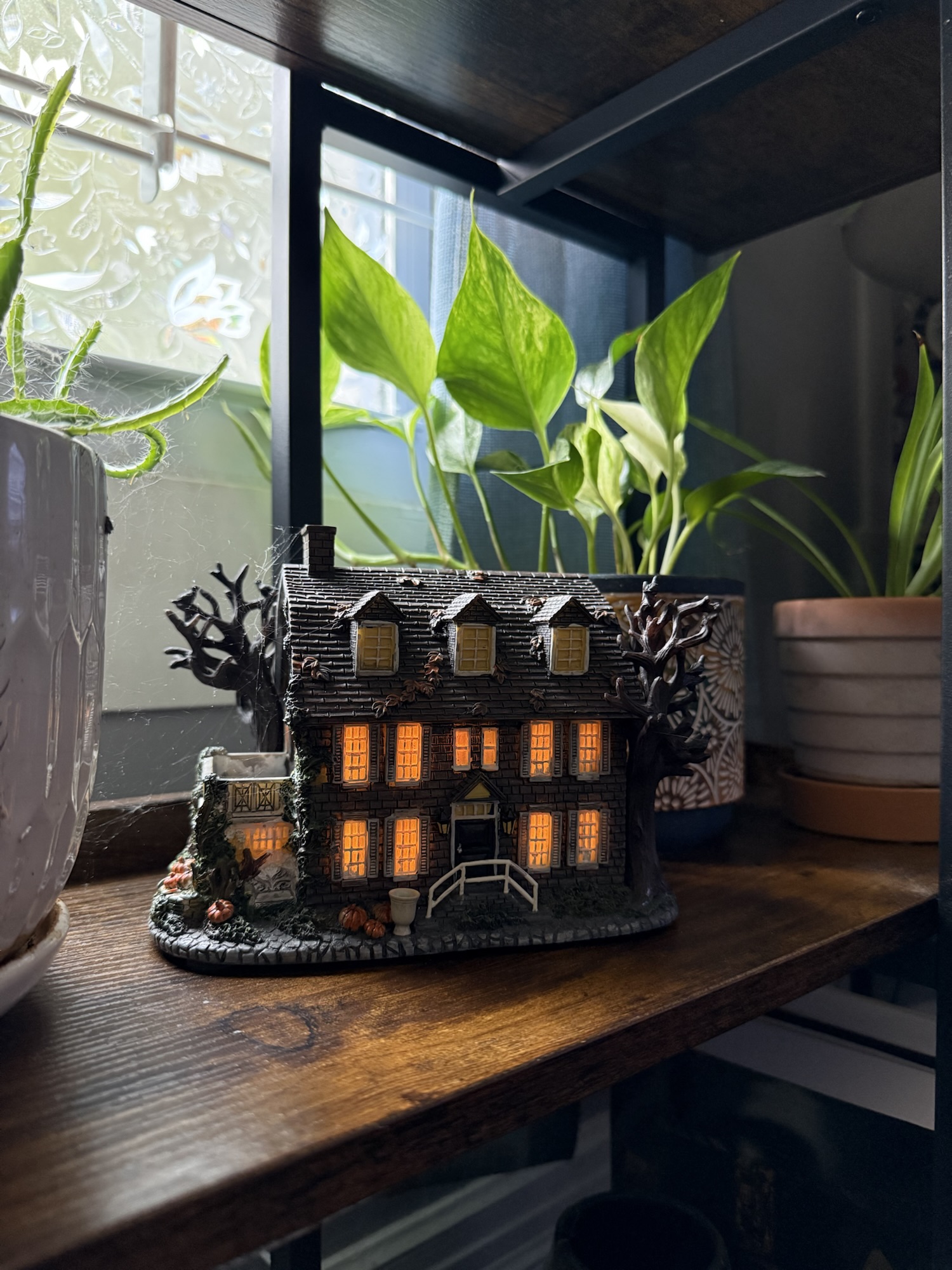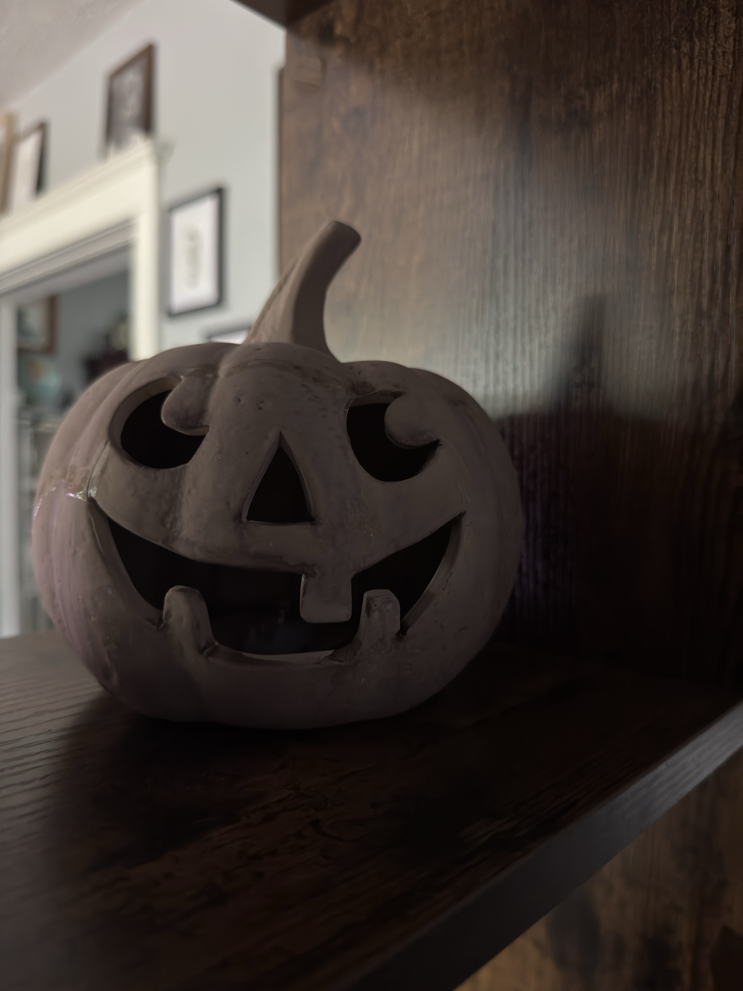 Obviously, I love blue. So I started with adding a few blue pumpkins mixed in with whatever I had leftover. My parents, and Dave, gifted me two of my most favorite items: a light-up haunted house, and a ceramic pumpkin with an almost folk pattern. Both have remained up all year, because us spooky-nerds have wants and needs.