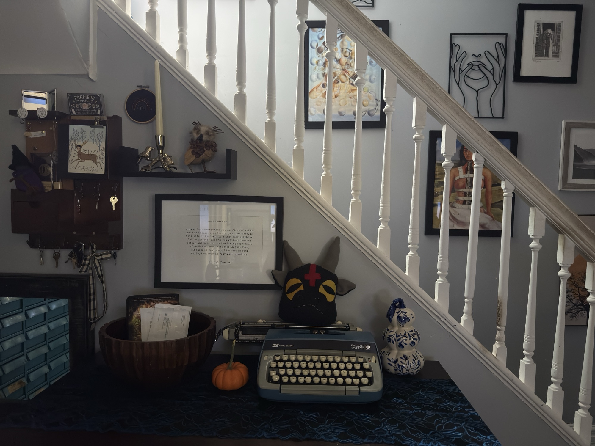 The first set of photos are of the entryway to our home, that is quickly becoming one of my favorite areas of the house. I never used a front door as the main entrance before, I have always lived on corner-lots in houses, or in an apartment. We have a giant tool-chest thing, and my old table set from the dorm as the furniture, and new MCM shelves that Dave installed earlier in the year. Most importantly: the blue typewriter that Dave gifted me last year that was my favorite item to display at Dreamtroit.