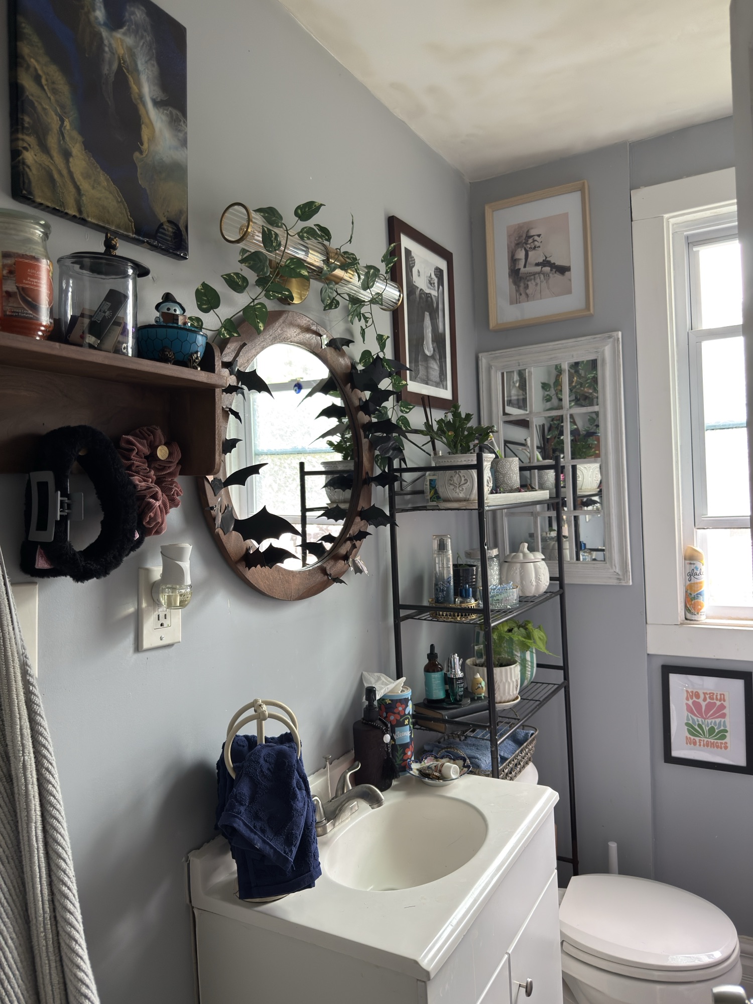 Last year I had the great idea to put a bunch of cheap bats all over the walls, and despite putting up 834 bats, 835 bats remained. Our bathroom mirror is Pinterest porn, and I am not mad.