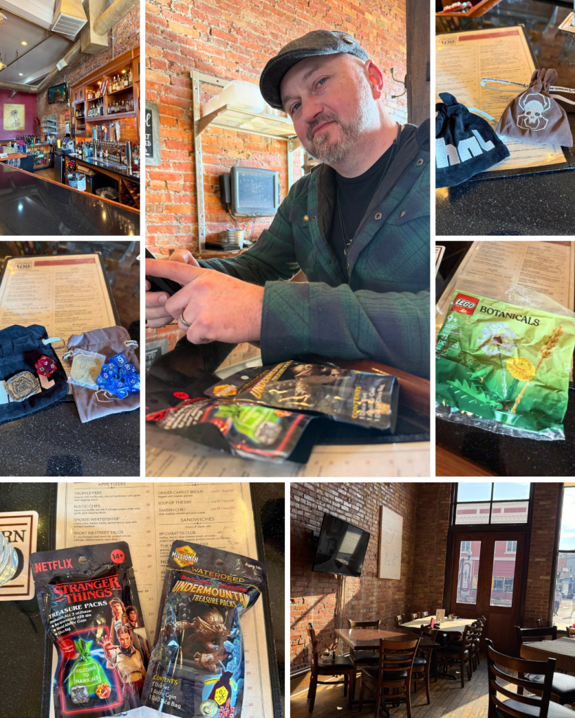 The Gaming Cantina was choc-full of all kinds of goodies! We left with two mystery bags; A D&D one for Dave, and a Stranger Things one for myself. We decided to eat our first meal of the day at 3:30pm, at Tavern 109, and to open said mystery bags…and also put together Legos, because I am literally twelve. The bartender was really excited, she likes Legos, so it was nice to meet another twelve year old in the wild.